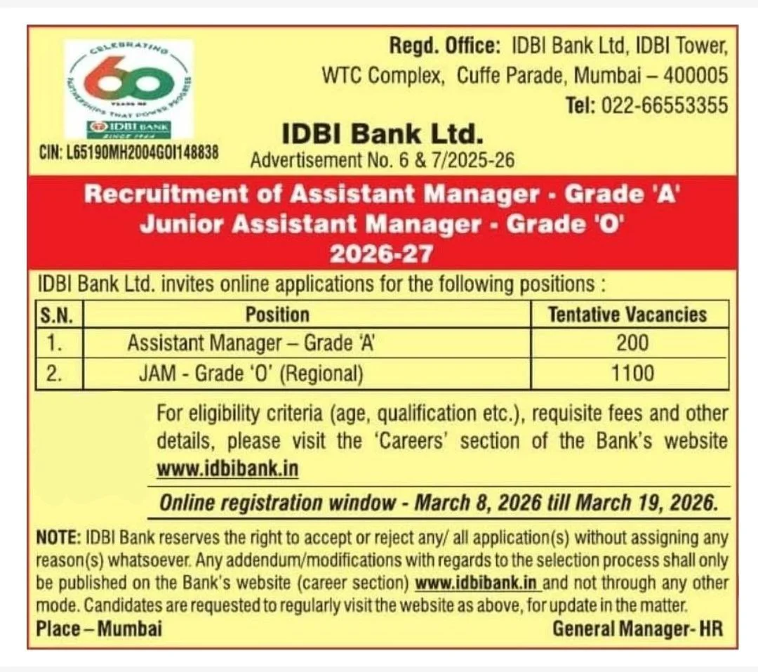 IDBI Bank Recruitment 2026: IDBI Bank की तरफ से Assistant Manager और Junior Assistant Manager पदों पर आधिकारिक वैकेंसी जारी कर दिया गया है और इसमें टोटल 1300 पदों पर भर्ती की जा रही है। इच्छुक उम्मीदवार IDBI की आधिकारिक वेबसाइट के माध्यम से 8 मार्च से लेकर 19 मार्च 2026 के बीच ऑनलाइन आवेदन कर सकते हैं। संपूर्ण भारतवर्ष से महिला और पुरुष उम्मीदवार दोनों ही आवेदन कर सकते हैं।